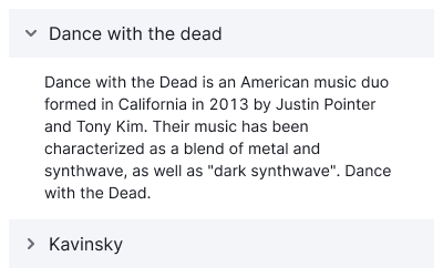 - You have a large amount of data and don't want to show it all at once. By hiding a part of the content, you help users focus on their task. For example, you can use an accordion in a table with a large amount of data or in large widgets with additional information.