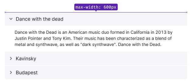 Remember about visual hierarchy when designing the accordion. If you use, the accordion, for example, in a table, then the title inside the accordion shouldn't be equal to or greater than the size of the main titles on the page.