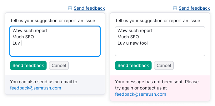 Feedback component is the form for sending feedback or suggestions about the product. In most cases it opens from the "Send feedback" link or button.