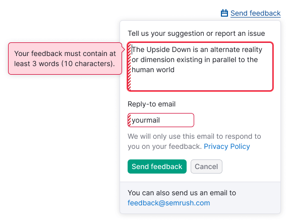 - There is a limitation for a minimum of 10 symbols and not less than 3 words in this textarea for submitting it. If the entered message doesn't match these rules, after submitting it user gets an error with the tooltip describing how many symbols/words are required for submitting feedback.