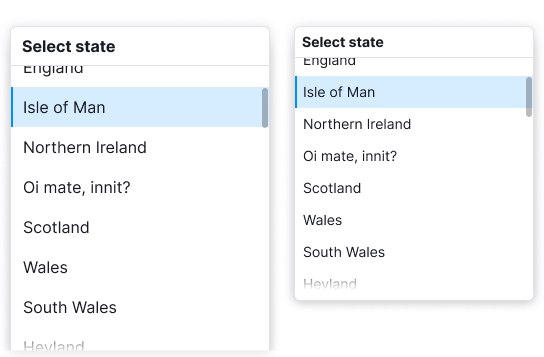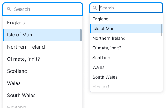 If the menu has more than seven items, limit its height and add scroll. We also recommend adding search input to such lists.